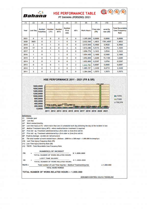 Komitmen DAHANA dalam mencegah kecelakaan, meningkatkan kualitas kesehatan dan melindungi lingkungan diukur dengan menerapkan indikator Kinerja Utama HSE seperti zero accident, zero occupational illness dan zero environmental pollution melalui implementasi kerja yang aman, sehat dan ramah lingkungan.